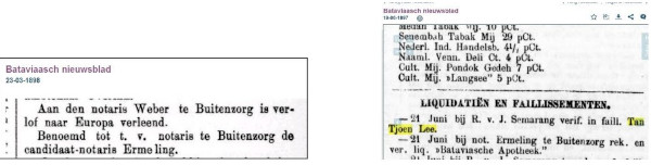 In de familie gaat het verhaal dat Tan Tjoen Lee ooit failliet was verklaard maar door de tussenkomst van ene Ermeling, die met een geldsom borg stond, werd het faillissement niet doorgezet. In de familie van Tan Tjoen Lee en of Tan Goan Piauw is de dankbaarheid voor de daad van de heer Ermeling zodanig dat een groot portret met de hierboven afgebeelde foto van hem bij het familie altaar hing totdat we naar Nederland vertrokken. De zoektocht naar meer informatie over Ermeling leverde van een Notaris Ermeling een paar krantenberichten op, helaas geen duidelijkheid over het verhinderen van een op handen zijnde faillissement van Tan Tjoen Lee. |